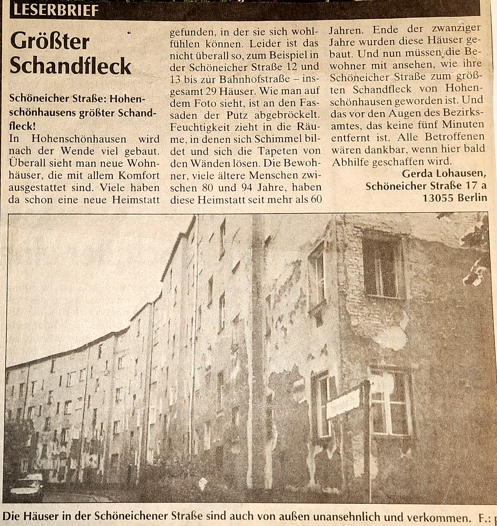 Zeitungsartikel von 1996 - Auf dem Foto ist die Schöneicher Straße 12-12F zu sehen.